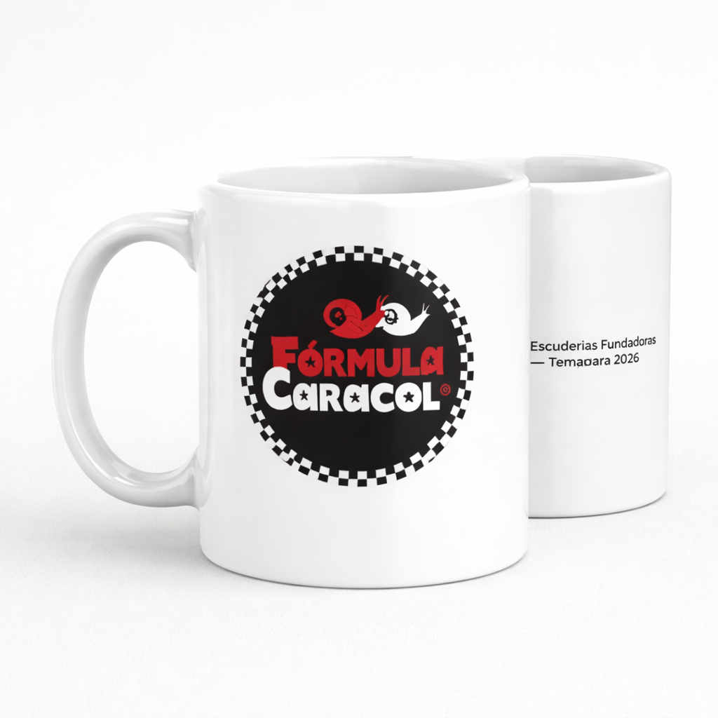 Taza oficial de la primera temporada de Fórmula Caracol. Edición inicial 2026 con el emblema de la competición. Perfecta para ver las carreras, trabajar o preparar la estrategia de tu escudería desde casa.